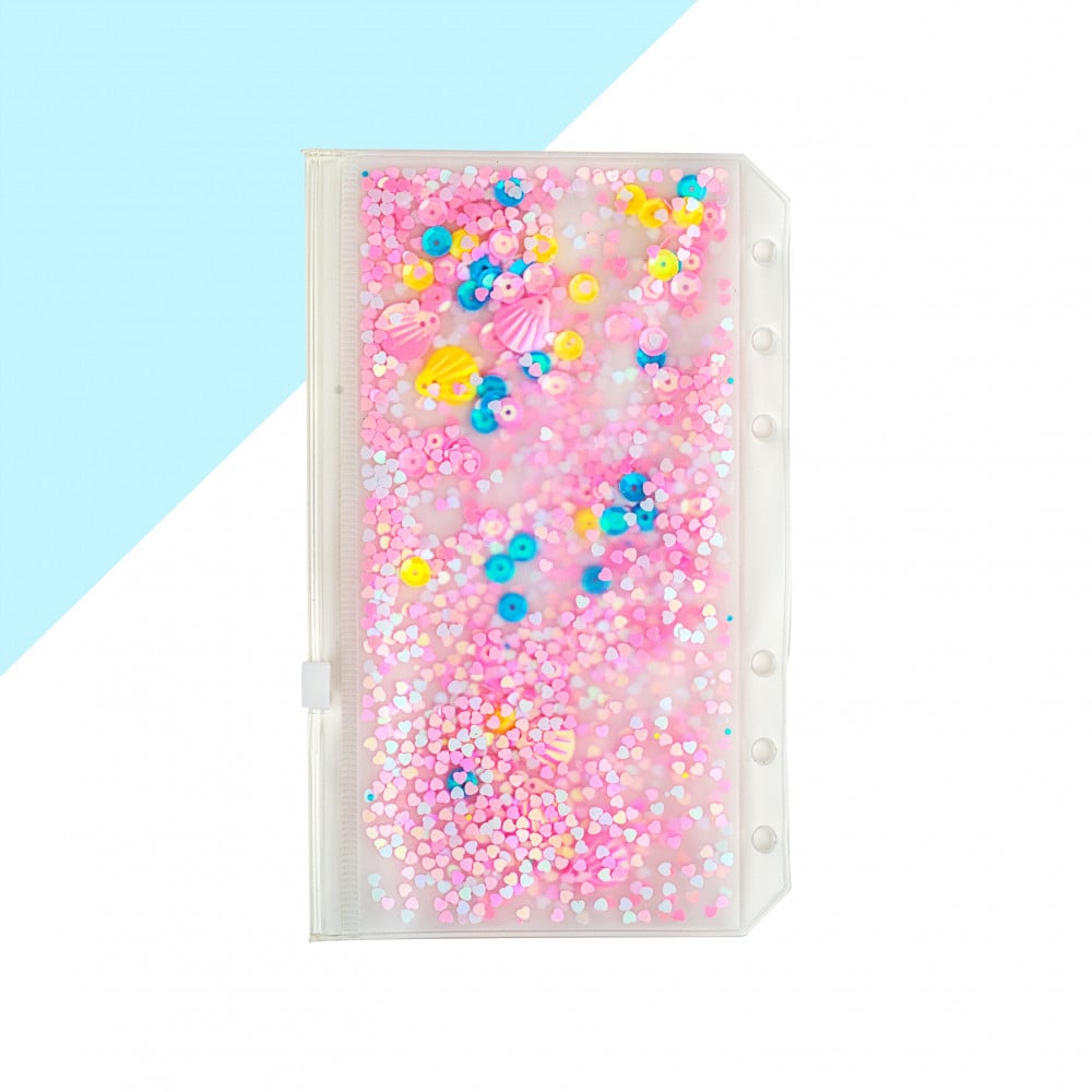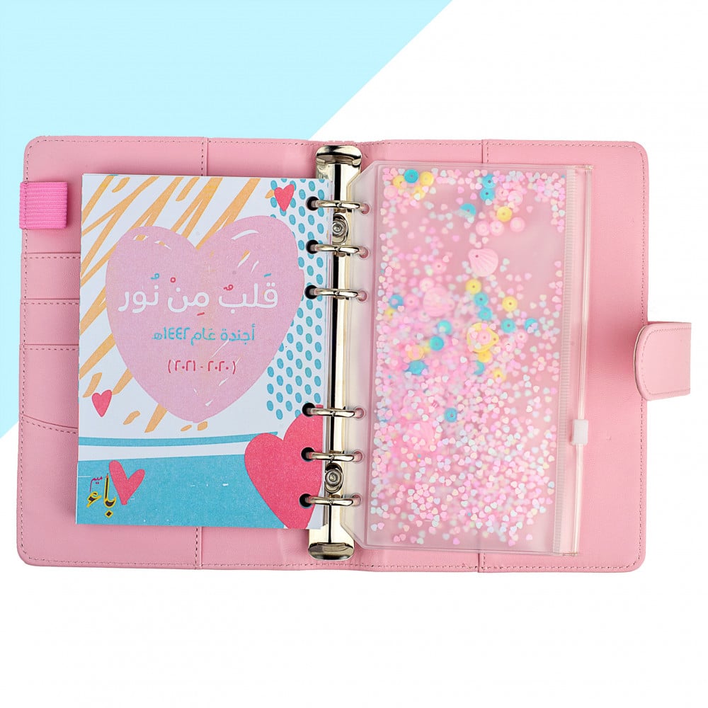 جيب مقاس A6 مملوء بالقليتر الوردي على شكل قلوب وأصداف ساحرة ، وثابته بداخل الغلاف ، يتميز الجيب بغلقه عن طريق السحاب ، وانه مخرم وجاهز ليُزين بلانرك ويضيف اليه لمسة رائعة وجميلة .