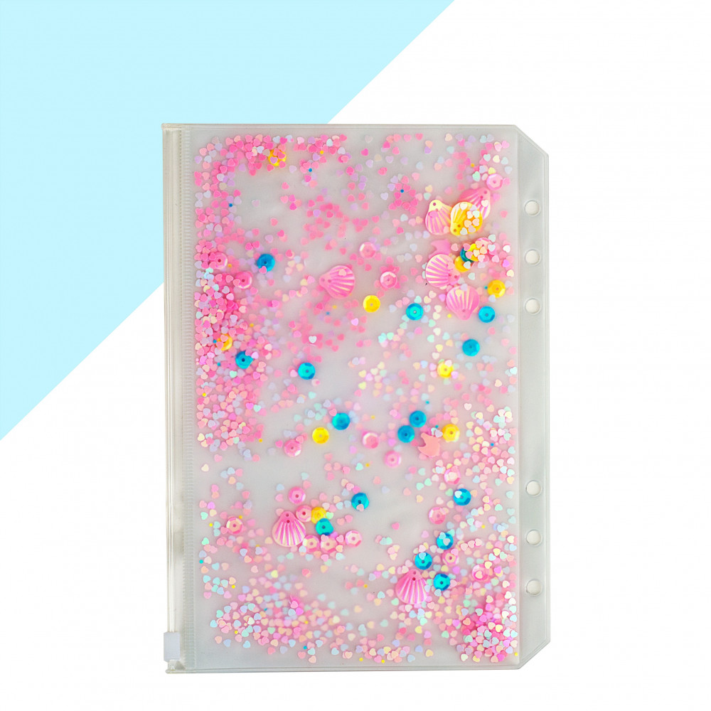 جيب مقاس A5 مملوء بالقليتر الوردي على شكل قلوب وأصداف ساحرة ، وثابته بداخل الغلاف ، يتميز الجيب بغلقه عن طريق السحاب ، وانه مخرم وجاهز ليُزين بلانرك ويضيف اليه لمسة رائعة وجميلة .